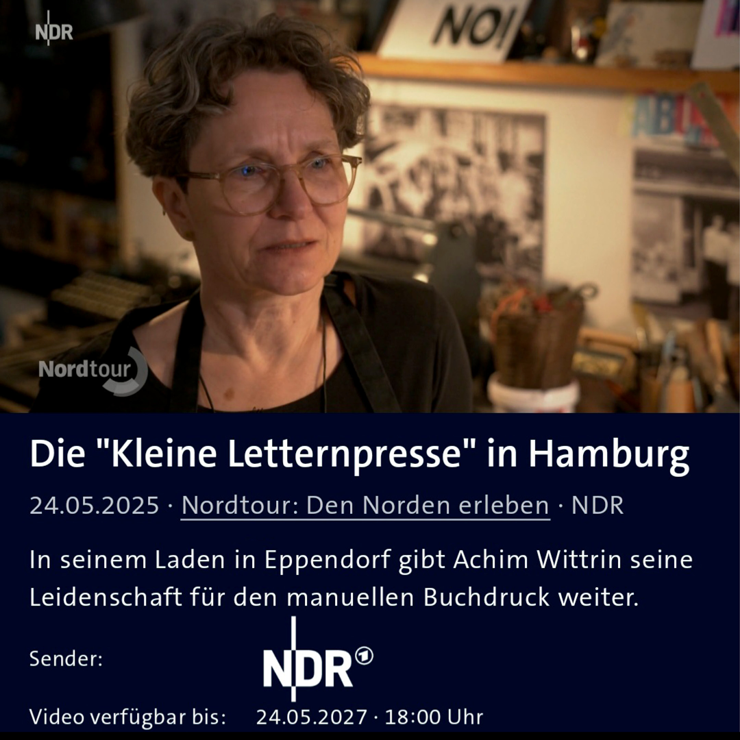 Als Schriftsetzerin arbeite ich inzwischen regelmäßig in der Kleinen Letternpresse von Achim Wittrin. Nun war der NDR war zu Besuch, um einen Beitrag fürs Fernsehen zu unseren Workshops zu drehen: