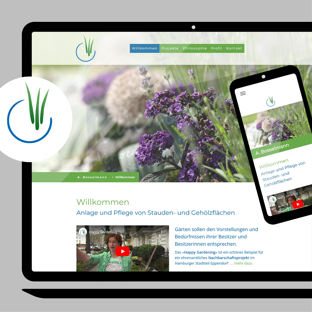 Mit dem Leitbild: »Gärten sollen den Vorstellungen und Bedürfnissen ihrer Besitzer und Nutzer entsprechen« arbeitet die Hamburger Garten- und Landschaftsplanerin wieder in ihrem Element als Landschaftsgärtnerin. Hierzu brauchte es ein ReDesign des Logos, Anpassung der Geschäftsausstattung und eine deutlich modernere, flexible Webseite, um ihre vielfältigen Projekte darzustellen.