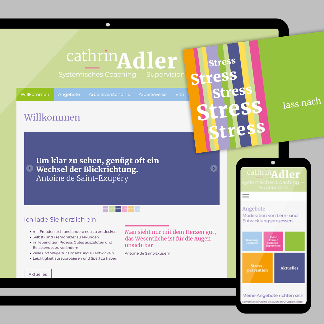 Bei diesem Projekt sollte alles neu erstellt werden und dies mit rein grafischen Elementen gestaltet sein. Die Kundin wünschte sich weiche Pastelltöne ohne Verläufe. Daher boten sich Kacheln und einfarbige Flächen an, auf denen nur mit Text ohne Weiteres gestaltet werden konnte. Neben dem Logo und den Geschäftspapieren ist auch eine Webseite und eine Postkartenserie entstanden. Die gesamte Textkonzeption und das Lektorat hat Gerda Elmerhaus erstellt.