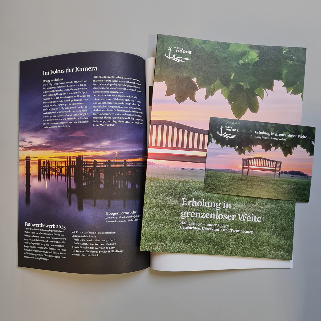 Die Gemeinde Hallig Hooge wünschte eine Überarbeitung und Neugestaltung des Gastgeberverzeichnis. Es sollte mehr ein Magazin werden und erzählerisch zu einer Reise auf die Hallig einladen. Eine klare Rubrizierung mit Farbreitern, Halligkarte, Platz für redaktionelle Texte und auch ein neues Konzept für die Anzeigenformate der Vermietungen war gewünscht. Dazu wurden Piktogramme entwickelt und ein Farbcode zur räumlichen Orientierung gewählt. Außerdem konnten wir durch eigene Fotos eine klare Bildsprache sprechen.