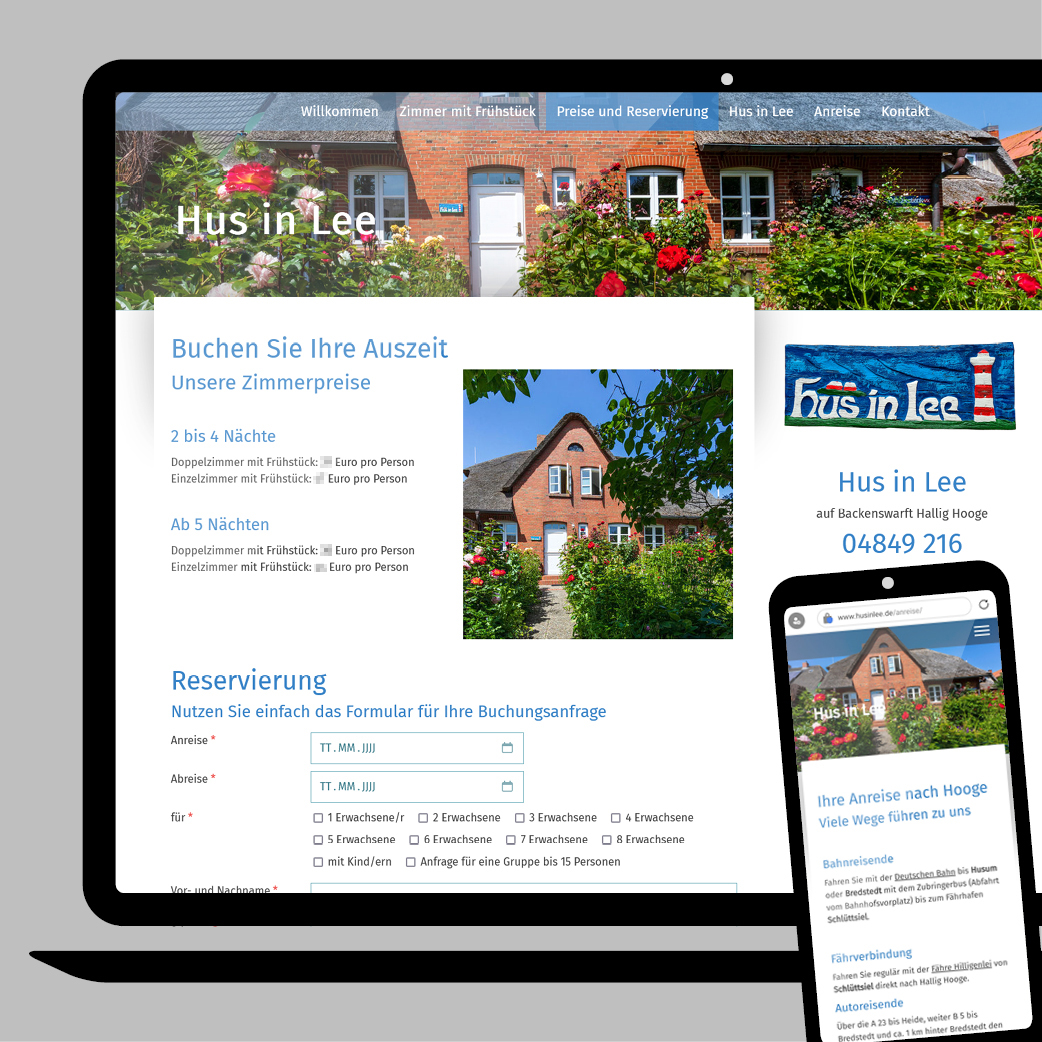 Für das Gästehaus auf Hallig Hooge mit Zimmervermietung brauchte es eine Überarbeitung der Webseite. Hierbei ist nicht nur das anschauliche Darstellen der Unterkunft, sondern auch die Möglichkeit eine Buchungsanfrage zu stellen oder direkt zu reservieren. Auch ein Lageplan und Anfahrt zur Hallig mit öffentlichen Verkehrsmitteln oder Auto und der Fähre sind neu hinzugekommen. Das Friesenhaus-Foto ist von Mirko Honnens.