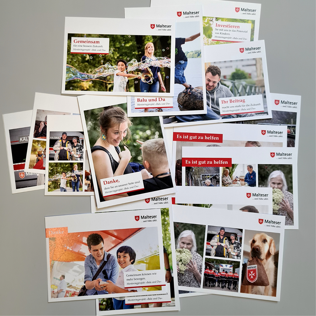 Der Hamburger Malteser Hilfsdienst wirbt für die vielen sozialen und karitativen Angebote, daher braucht es verschiedenste Versionen und Serien von Postkarten. Diese werden an die vielen Ehrenamtlichen sowie zu Spendenaufrufen verwendet.