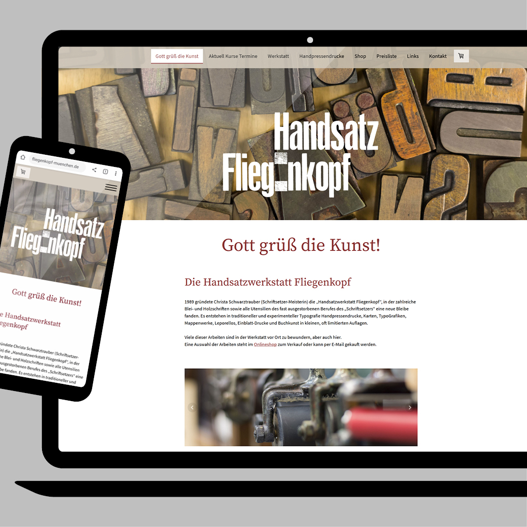 Für ein traditionelles Handwerk einen digitalen Verkauf zu ermöglichen ist eine besondere Aufgabe und braucht Wissen aus beiden Arbeitswelten. Die Handsatzwerkstatt Fliegenkopf von der Schriftsetzermeisterin Christa Schwarztrauber aus München ist ein schönes Projekt geworden und der umfangreiche Onlineshop, der ihre vielfältigen kreativen Arbeiten und Produkte aller Art ein gutes Mittel in Zeiten der Pandemie trotzdem zu existieren: