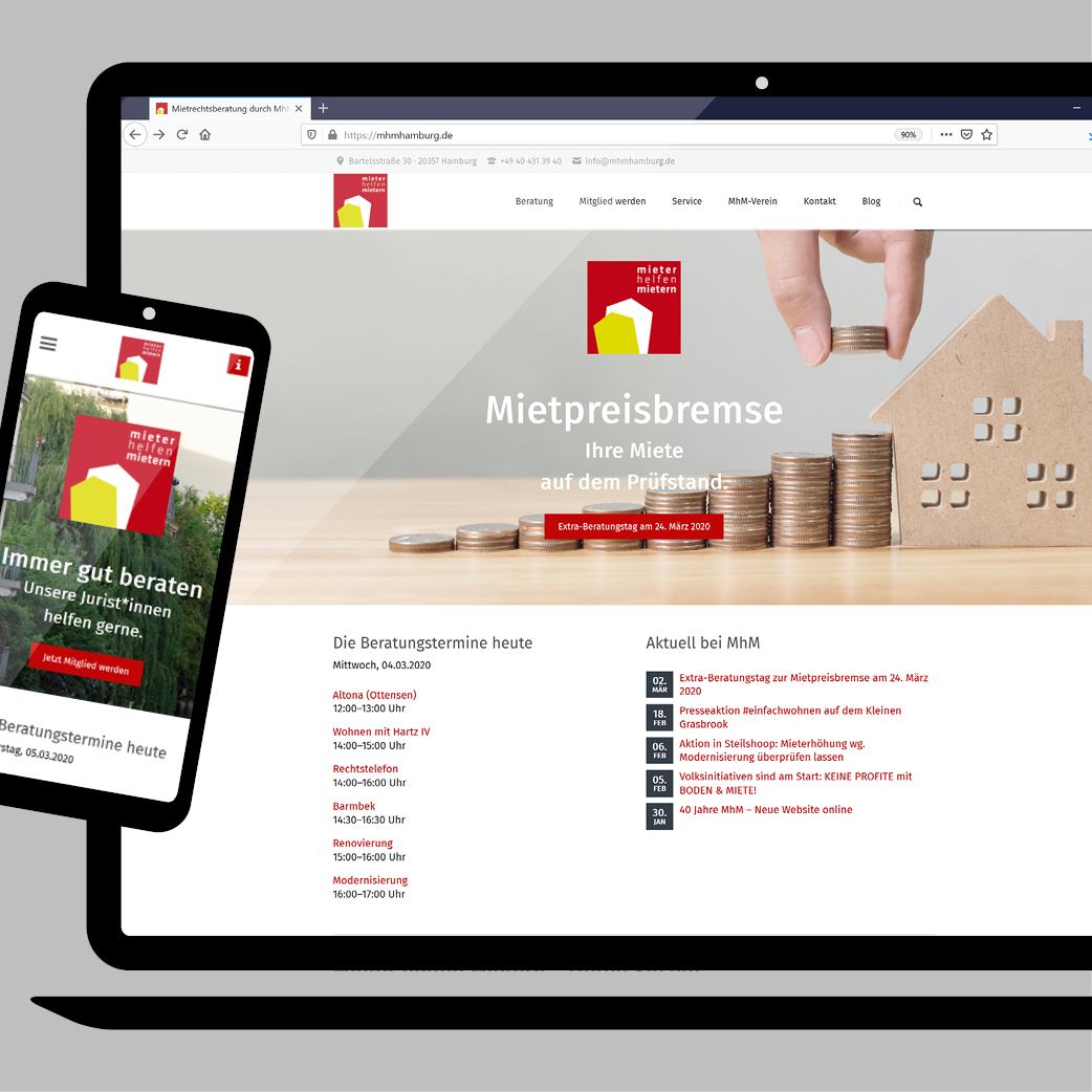 Der Hamburger Mieterverein e.V. Mieter helfen Mietern hat einen komplett neugestaltete und modernisierte Website bekommen. Dies ist in einem Contentmanagement System entwickelt sowie programmiert worden und bietet neben einem Blog, diversen Anmeldeformularen auch Terminvergaben und eine Chatfunktion.
