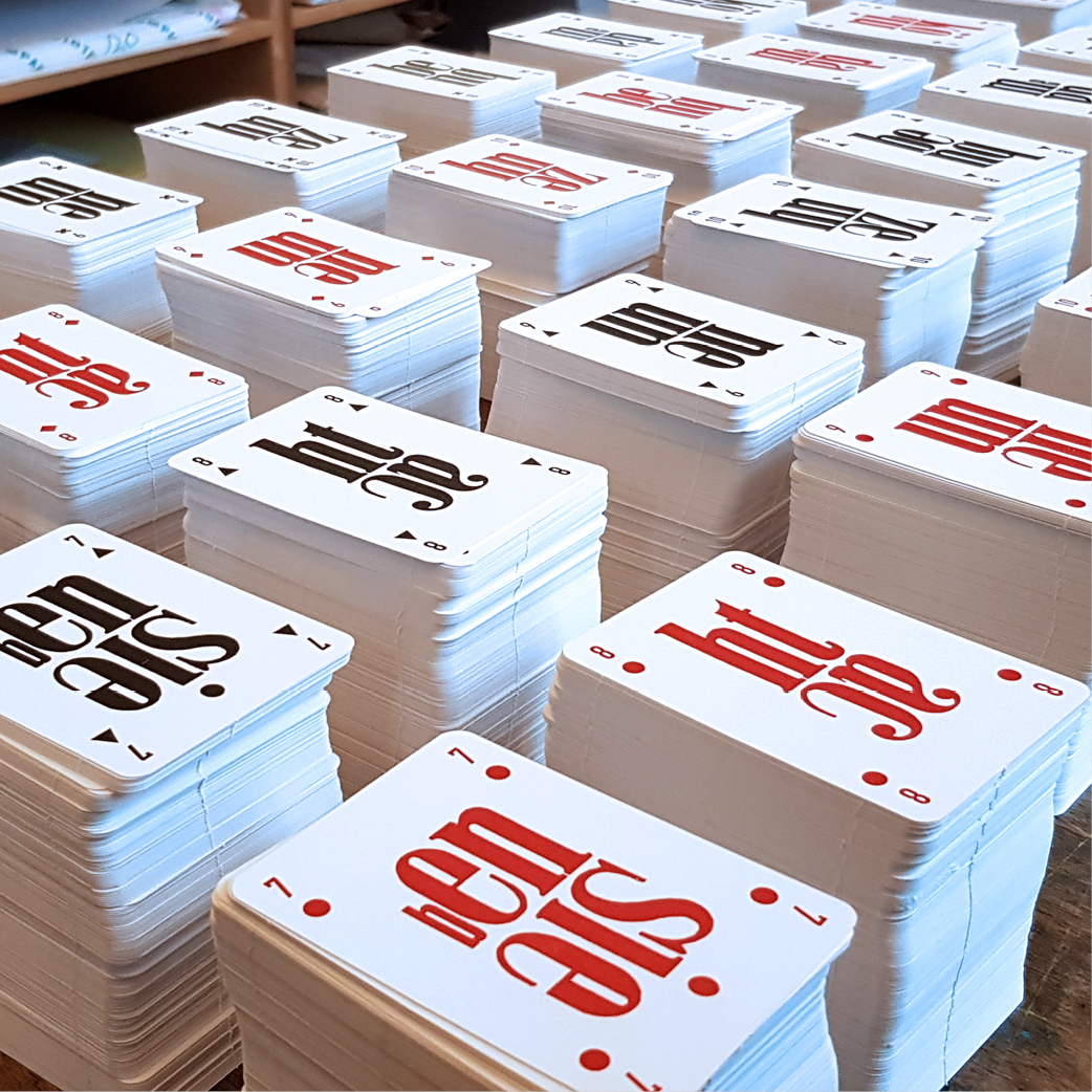 Das Kartenspiel ist auf der TypoWalz von Jana Madle in der Spielkartenfabrik Stralsund entstanden. Diese 2. Auflage ist im traditionellen Handsatz und Buchdruck mit großer Hilfe von dem Buchdrucker Walter Fischer im Hamburger Museum der Arbeit auf einem Original Heidelberger Cylinder im gedruckt und auf dem Heidelberger Tiegel gestanzt worden. Die Spielkartenbilder sind von Hand gesetzte TypoGrafiken, gedruckt auf Fedrigoni Recycling-Naturpapieren, inkl. Steckschachtel mit Titel und Text auf der Rückseite, verleimt in Handarbeit. Der traditionelle Herstellungsprozess ist ausführlich beschrieben: