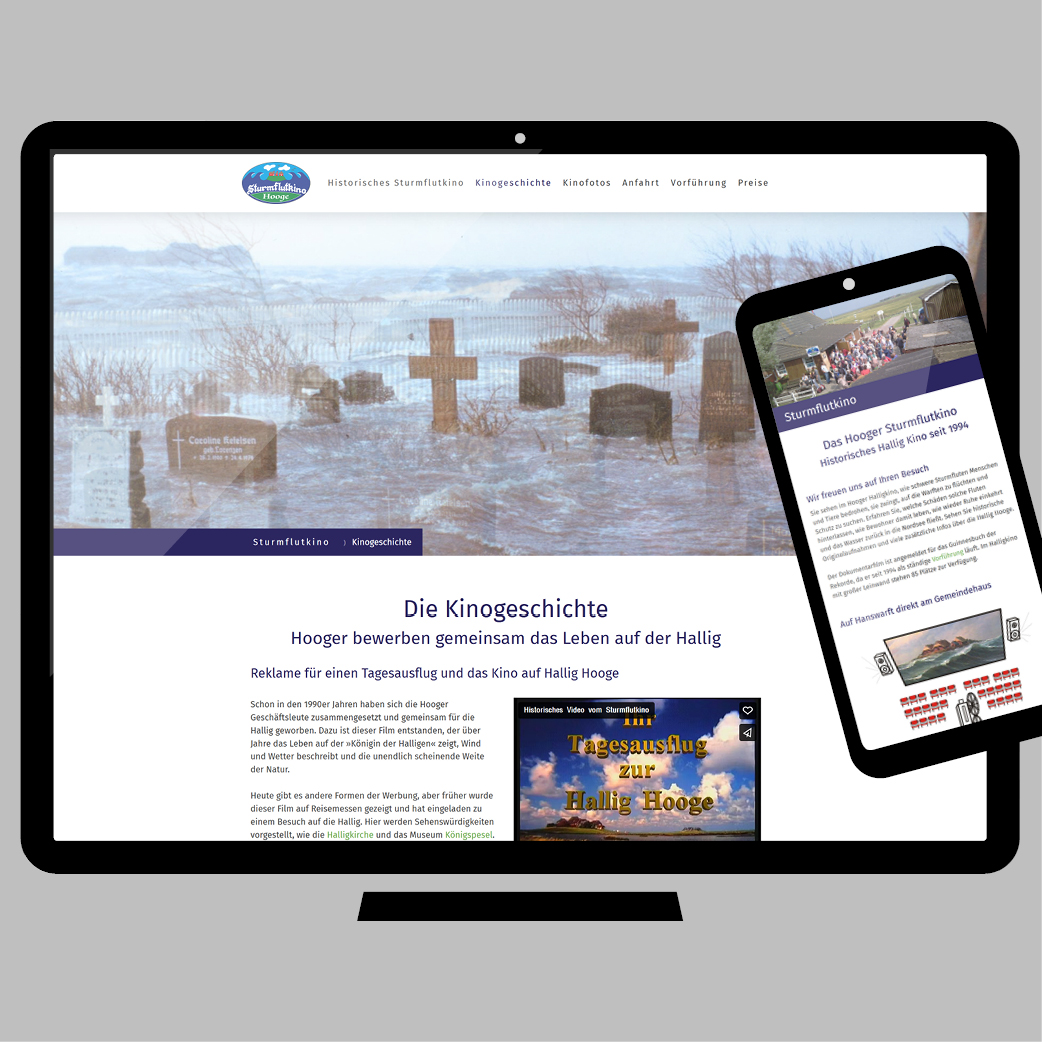 Schon in den 1990er Jahren haben sich die Hooger Geschäftsleute zusammengesetzt und gemeinsam für die Hallig geworben. Dazu ist ein Werbefilm entstanden, der über Jahre das Leben auf der »Königin der Halligen« zeigt, Wind und Wetter beschreibt und die unendlich scheinende Weite der Natur. Historische Hallig Kino ist seit 1994 im Betrieb und brauchte eine moderne und optimierte Webseite.