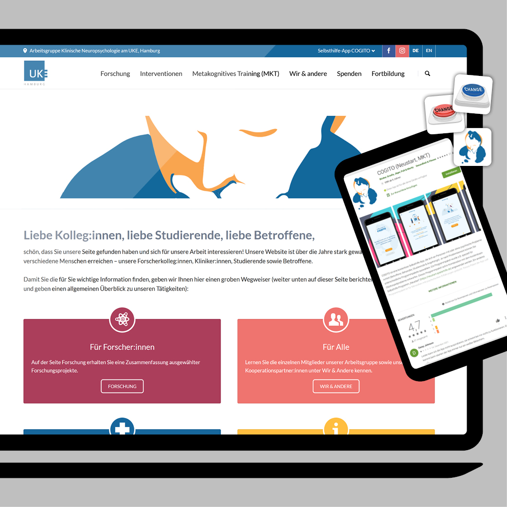 Die Website der Klinischen Neuropsychologie am Universitätsklinikum Hamburg-Eppendorf zeigt sich im neuen Gewand und hat ein neoterisch sowie modernes Screendesign bekommen, um möglichst viele Zielgruppen anzusprechen. Und das im wahren Wortsinn, denn die Seite für Forschende, Klinikerinnen und Kliniker, für Betroffene und Studierende ist mehrsprachig angelegt: Das umfängliche Therapie Programm MKT (Metakognitives Training) umfasst über 40 Sprachen!
